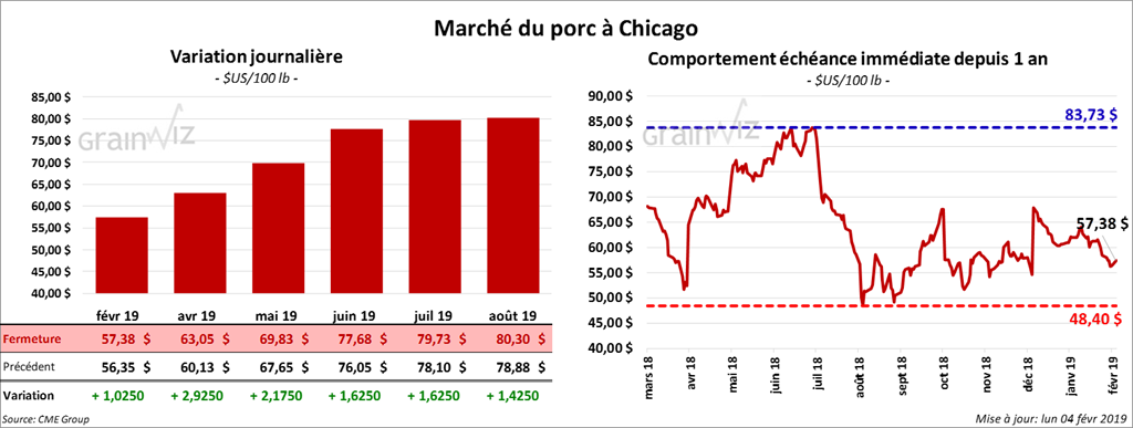 Les contrats de porc à Chicago ont fini la journée en hausse de 30 cents à 2,925 $. Par contre, les gains pour le contrat avril 19 ont été limités un peu plus tôt durant la journée.