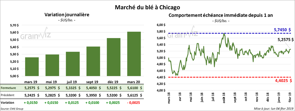 Les inspections à l’exportation de tous les types de blé ont été de 440,031 tonnes durant la semaine du 31 janvier dernier. Ce serait une hausse de 19,7 % par rapport à la semaine précédente et de 2,43 % comparativement à la même semaine en 2018. Au cumulatif, pour l’année en cours, les inspections à l’exportations de blé US ont été de 14,822 millions de tonnes, une baisse de 10,95 % par rapport à la même période l’an passé.