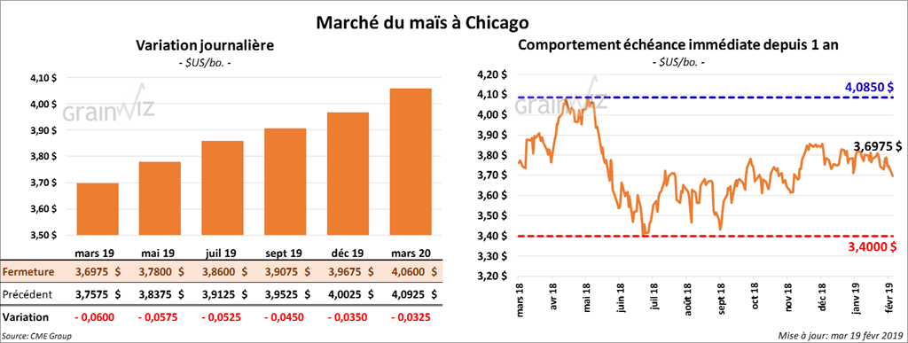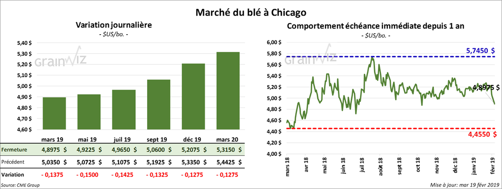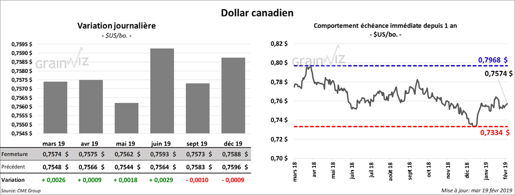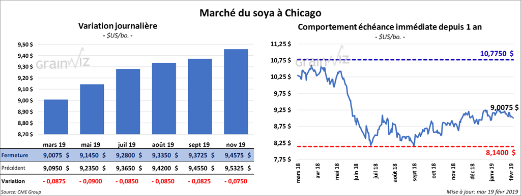 Durant l’avant-midi, le rapport sur les inspections à l’exportation a indiqué que 1,031 million de tonnes de soya US ont été exportées durant la semaine du 14 février dernier. Ce serait une diminution de 3,37 % par rapport à la semaine précédente, mais également une hausse de 7,20 % comparativement à la même période en 2018. À noter que c’est la première semaine de l’année commerciale actuelle où il y a un dépassement par rapport à celle de l’an passé à la même période. Il reste toutefois un retard de 490 millions de boisseaux. Les exportations de soya US vers la Chine ont été de 404,420 tonnes.