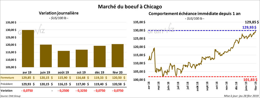 Les contrats de bœuf à Chicago ont terminé la journée en baisse de 35 cents. Le contrat février 19 a expiré à 129,95 $. Les contrats de veau aux échéances les plus rapprochées ont fini la session au neutre baissier à 1,075 $.
