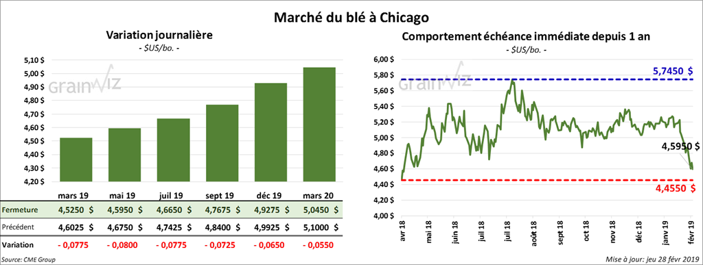 La plupart des contrats de blé d’hiver US ont fini la journée avec des pertes de 1 à 8 ¼ cents. À Chicago, les baisses étaient plus importantes. Toutefois, en raison des inquiétudes concernant le printemps prochain, les contrats de blé à Minneapolis ont terminé la session en hausse de 2 à 5 ¼ cents.
