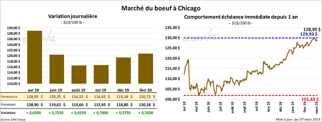 Les contrats de bœuf à Chicago ont terminé la journée avec des gains de 92,5 cents. Les contrats de veau aux échéances les plus rapprochées ont également fini dans le vert par trois chiffres. La faiblesse des prix du maïs aurait aidé le secteur.