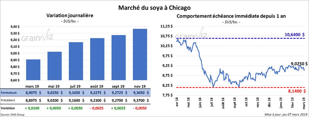La plupart des contrats de soya US aux échéances les plus rapprochées ont fini la session en hausse d’une fraction à 1 cent. Les contrats de tourteau aux échéances les plus rapprochées ont terminé la journée avec un gain de 20 cents/tonne. Toutefois, l’huile a perdu 10 points.