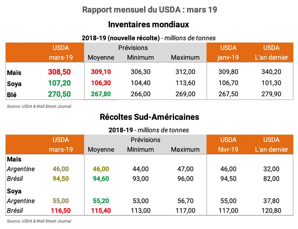 Voici un aperçu des nouvelles prévisions du USDA avec la publication de son rapport mensuel de mars 2019. Pour accéder au rapport complet (en anglais): WASDE Mars 19