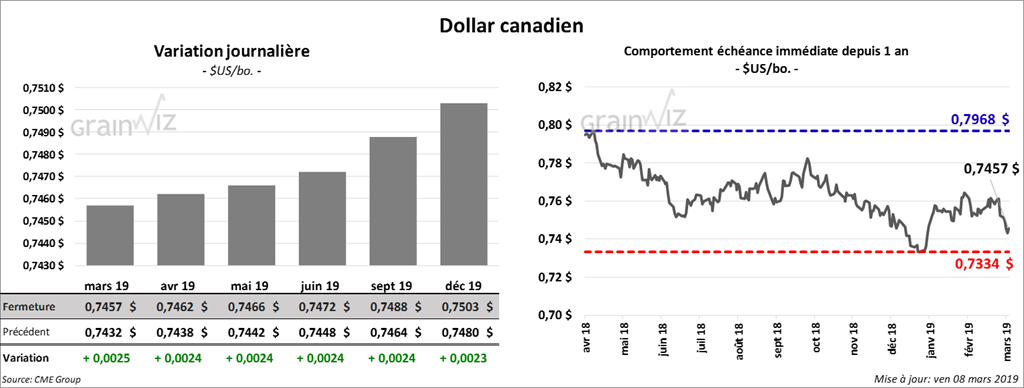 Mondialement, les productions du Brésil et de l’Argentine restent inchangées à respectivement 94,5 millions de tonnes et 46 millions de tonnes. Les inventaires mondiaux de fin d’année 2018/2019 sont en baisse de 1,25 millions de tonnes à 308,53 millions de tonnes. En Chine, l’usage de la moulée de maïs est en hausse de 3 millions de tonnes, ce qui indique que dans ce pays, la diète porcine est davantage axée sur le maïs plutôt que sur le soya.