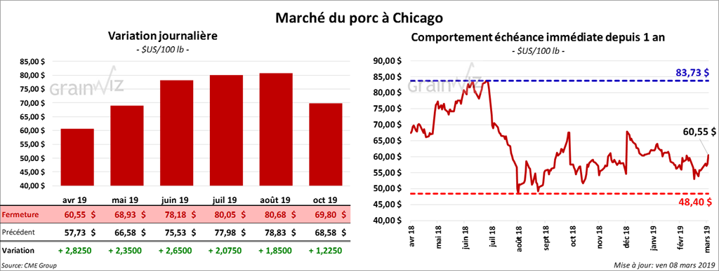 Ce vendredi, les contrats de porcs à Chicago étaient particulièrement forts. À la fermeture du marché, ils avaient enregistrés des gains de 1,25 $ à 2,825 $. Pour la semaine, le contrat avril 19 a pris 7,36 %.