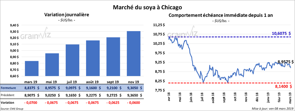 Les contrats de soya US aux échéances les plus rapprochées ont fini la session à la baisse de 6 à 7 cents. Pour la semaine, le contrat mai 19 a perdu 1,73 %. Les contrats de tourteau aux échéances les plus rapprochées ont également terminé la journée en recul de 2,90 $/tonne. L’huile a perdu 2 points.