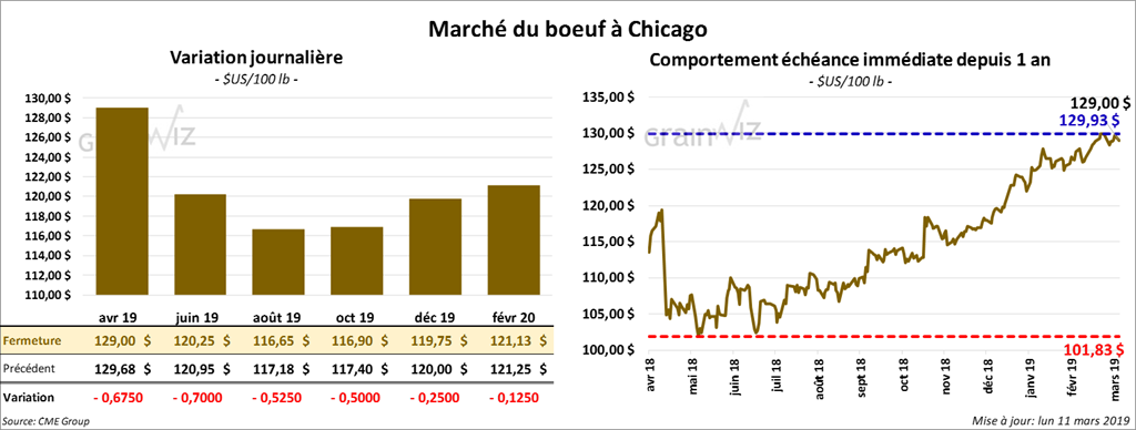 Le 8 mars dernier, le CME feeder cattle index était en baisse de 74 cents à 139,29 $. Cet après-midi, la valeur du surgelé a été en progression avec un «spread» Ch/Se à 7,73 $. La découpe «Choice» était dans le vert de 1,23 $ à 227,36 $. Celle «Select» a suivi en prenant 85 cents à 219,63 $.