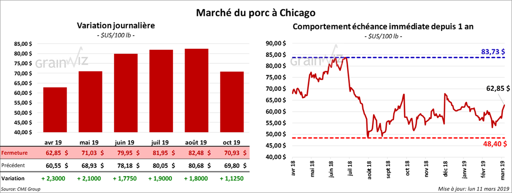 Le 7 mars dernier, le CME Lean Hog Index était en baisse de 4 cents par rapport au jour précédent à 51,71 $. Cet après-midi, la valeur moyenne des découpes a été en hausse de 1,38 $ à 66,42 $. Toutes les découpes étaient en progression. Sur une base nationale, le prix moyen au comptant de la carcasse a été en hausse de 1,24 $ à 47,20 $.