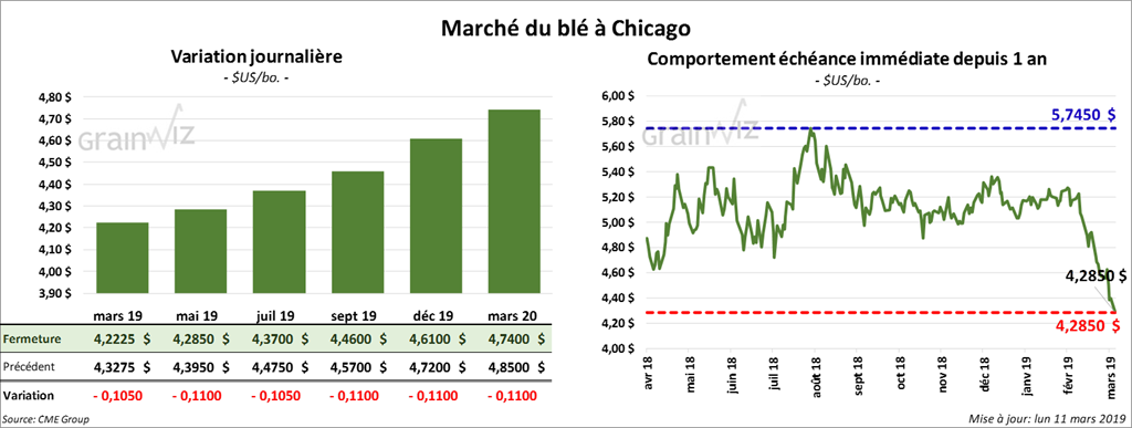 Durant la semaine du 7 mars dernier, les inspections à l’exportation de tous les types de blé US ont été de 592,001 tonnes, soit une augmentation de 21,1 % par rapport à la semaine précédente et de 38,06 % comparativement à la même période en 2018. Une cargaison de 42,000 tonnes de blé (probablement du blé dur rouge de printemps) a été expédiée en Chine.