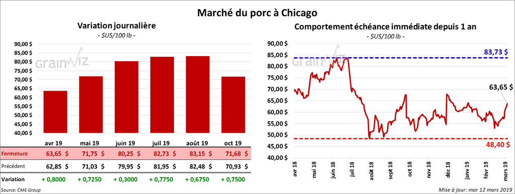 Le 8 mars dernier, le CME Lean Hog Index était en hausse de 27 cents comparativement au jour précédent à 51,98 $. Cet après-midi, le USDA, la valeur moyenne des découpes de porc a été en progression de 1,20 $ à 67,62 $. Le filet et les côtes étaient les seules découpes à la baisse. Sur une base nationale, le prix moyen au comptant de la carcasse de porc a été en hausse de 2,42 $ à 49,61 $.