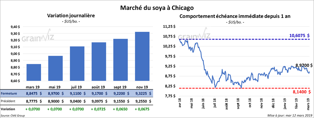 La plupart des contrats de soya à Chicago ont clôturé dans le vert de 6 à 7 cents. Les contrats de tourteau ont également terminé en hausse de 1,60 $/tonne. L’huile a gagné 38 points.