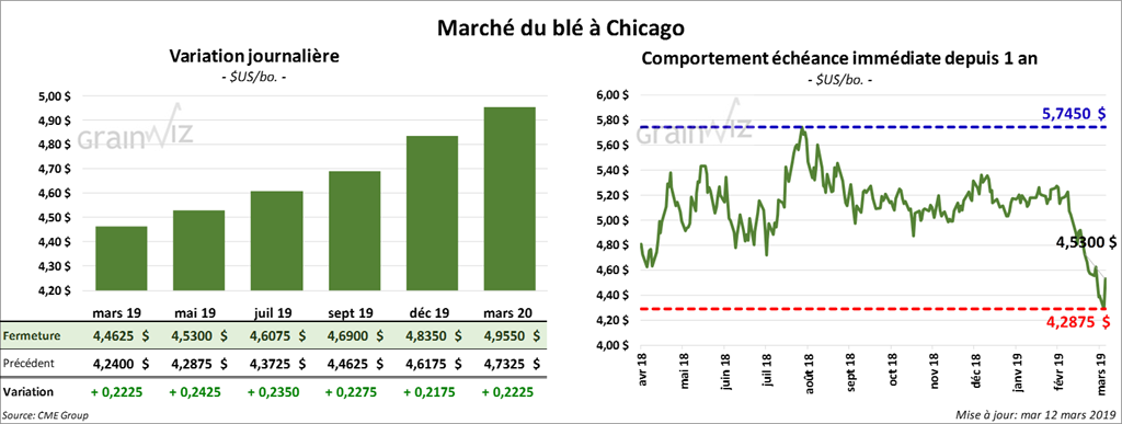 La majorité des contrats de maïs à Chicago ont terminé la journée en hausse de 3 ¾ à 5 cents.