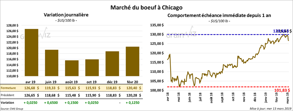 Les contrats de bœuf à Chicago ont fini la session au neutre à haussier de 65 cents. Les contrats de veau ont eu une progression partagée, avec un contrat mars 19 à la hausse de 25 cents. Les autres contrats aux échéances les plus rapprochées ont terminé dans le rouge.