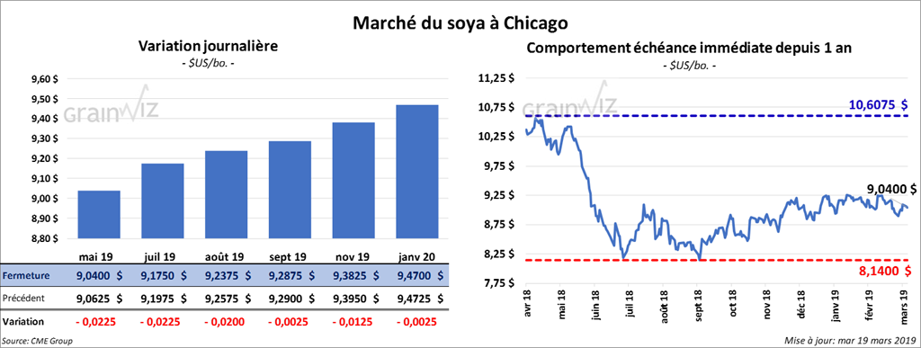 Les contrats de soya US aux échéances les plus rapprochées ont clôturé au neutre à baissier de 1 ¾ cents. Les contrats de tourteau ont plutôt fini en hausse de 1 $/tonne. L’huile a perdu 20 points.