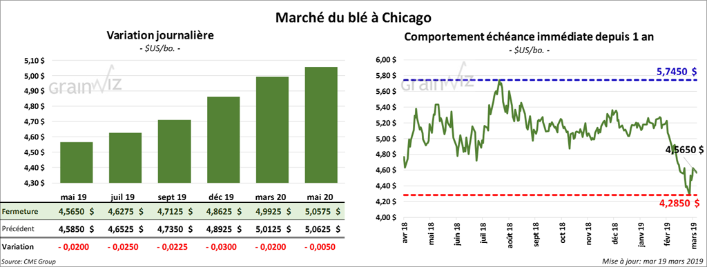 Les contrats de blé d’hiver US ont fini la session en baisse d’une fraction à 2 ½ cents. À Minneapolis, toutefois, les contrats ont terminé en hausse de 4 ½ cents.