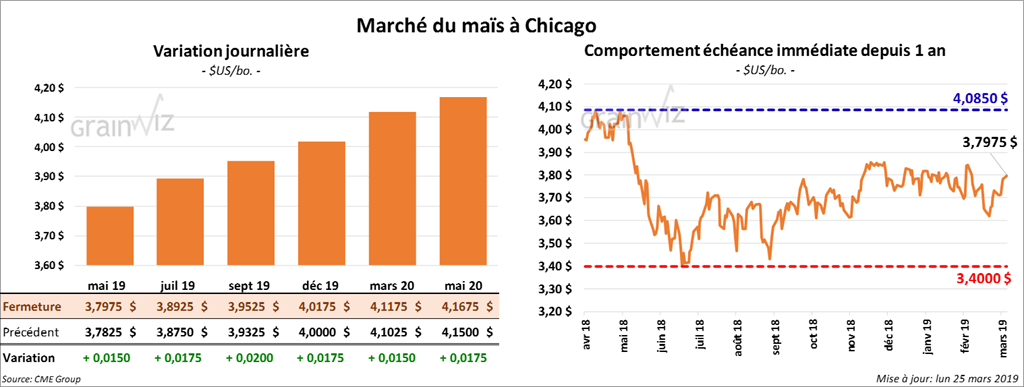 La plupart des contrats de maïs à Chicago ont clôturé en hausse de 1 à 2 cents. Des couvertures sur les positions vendeuses de même que les prévisions d’averses dans les secteurs déjà saturés de l’ouest du Corn Belt ont apporté un support à la hausse.