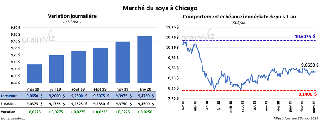 Le USDA a présenté son rapport sur les inspections à l’exportation dans le courant de l’avant-midi. Il a indiqué que 857,970 tonnes de soya ont été exportées dans la semaine du 21 mars dernier, ce qui est une légère hausse par rapport à la semaine précédente et de 20,84 % de plus qu’à la même période l’an passé. Du total, 335,241 tonnes étaient destinés à la Chine.