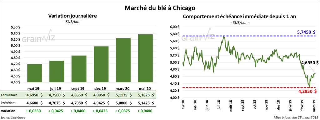 La majorité des contrats de blé d’hiver US ont fini la journée en hausse de 3 à 5 cents. À Minneapolis, la progression des contrats aux échéances les plus rapprochées n’a été que d’une cent. Les autres contrats ont tous terminé la session en baisse.