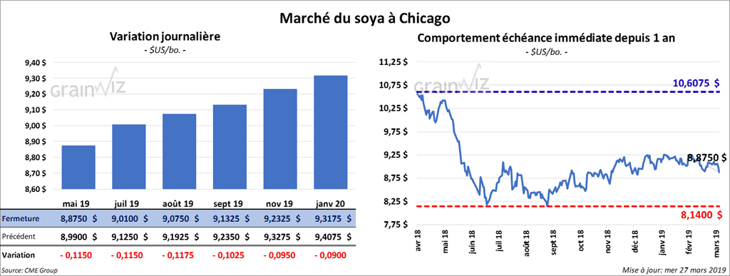 Les contrats de soya US aux échéances les plus rapprochées ont clôturé en baisse de 12 à 13 ¼ cents. Le marché s’est aligné en prévision des publications des rapports de vendredi. La faiblesse des monnaies sud-américaines a également exercé une pression négative sur le secteur du soya US. Les contrats de tourteau ont fini la session dans le rouge de 6,60 $/tonne. L’huile a gagné 17 points.