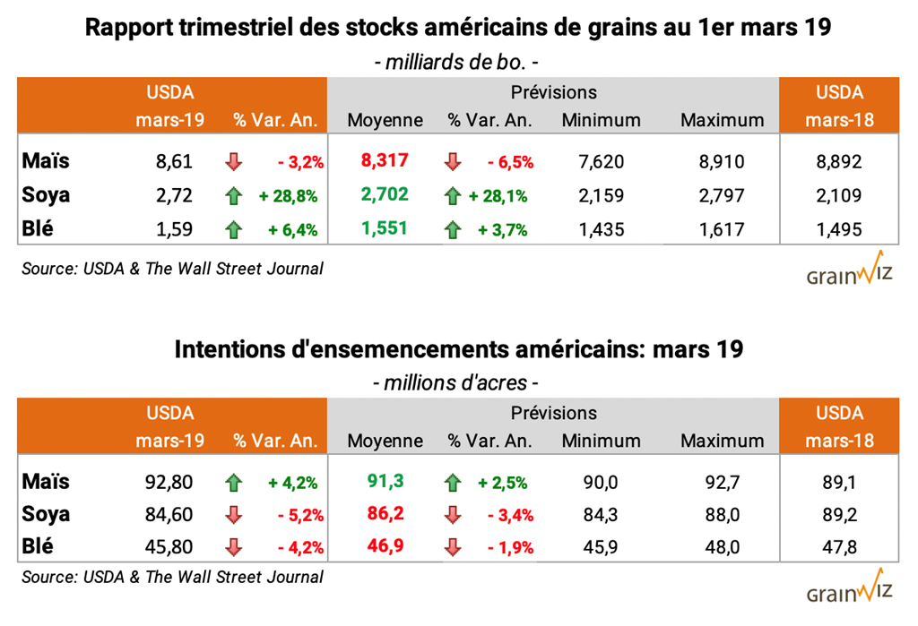 - Les producteurs américains ont l'intention de semer plus de maïs que ce que prévoyaient les marchés à 92,8 millions d'acres (l'an dernier 89,1 millions d'acres).