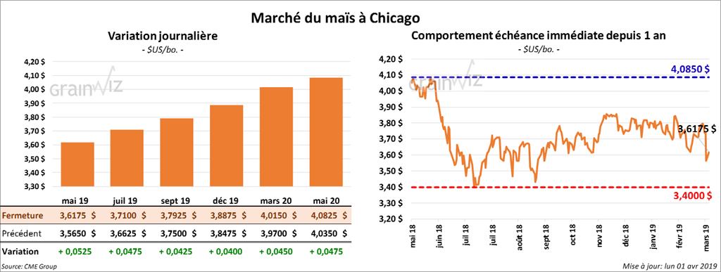 Les contrats de maïs à Chicago ont terminé la session en hausse de 2 à 5 ¼ cents.