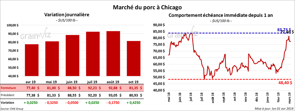 Le 28 mars dernier, le CME Lean Hog Index était en hausse de 2,15 $ par rapport au jour précédent à 73,87 $. Cet après-midi, la valeur moyenne des découpes de porc US a été en progression de 82 cents à 82,15 $. Sur une base nationale, le prix moyen au comptant de la carcasse était en hausse de 25 cents à 75,19 $.