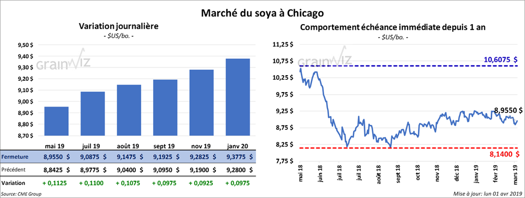 En ce début de semaine, les contrats de soya à Chicago ont fini la journée en hausse de 9 ¼ cents à 11 ¼ cents. Les contrats de tourteau aux échéances les plus rapprochées ont clôturé en progression de 2,90 $/tonne. L’huile a gagné 21 points.