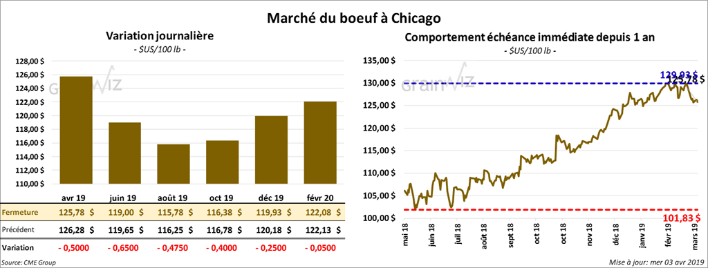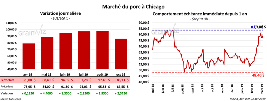 Les contrats de porc à Chicago ont encore une fois terminé la session avec de gros gains. Celui mai 19 a fini dans le vert de 4,40 $. Le contrat avril 19 a simplement gagné 12 cents.