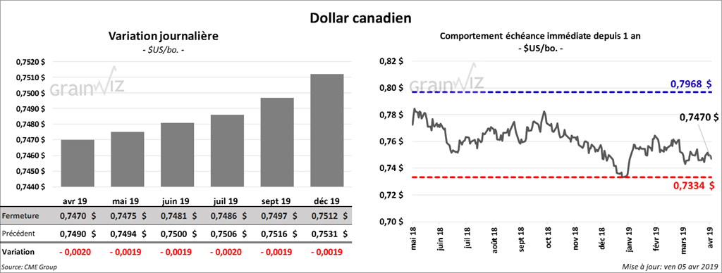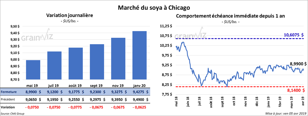 La plupart des contrats de soya à Chicago ont terminé la session en baisse de 6 à 7 ½ cents. Pour la semaine, le contrat mai 19 a progressé de 1,67 %. De leur côté, les contrats de tourteau de soya aux échéances les plus rapprochées ont fini la journée en recul de 3,90 $/tonne. L’huile a perdu 5 points.