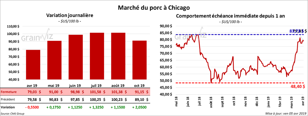 Le 3 avril dernier, le CME Lean Hog Index était en hausse de 56 cents par rapport au jour précédent à 78,26 $. Cet après-midi, la valeur moyenne des découpes a été en progression de 38 cents à 81,84 $. Sur une base nationale, le prix moyen au comptant de la carcasse était en baisse de 69 cents à 75,79 $.