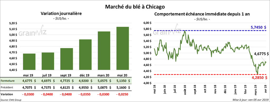 La majorité des contrats de blé US ont clôturé en baisse de 2 à 8 cents. À Minneapolis, pour une 7ème session consécutive, les contrats accusent une faiblesse. Pour la semaine, le contrat mai 19 a baissé de 5,81 %. À Kansas, les contrats de blé aux échéances les plus rapprochées ont fini en hausse de 0,29 %. À Chicago, la progression a été de 2,18 % depuis vendredi dernier.