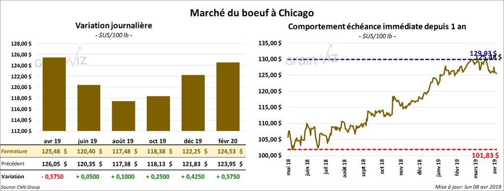 La plupart des contrats de bœuf à Chicago ont terminé la session à la hausse de 22,5 à 90 cents. Le contrat avril 19 a reculé d’un quart de cent. La majorité des contrats de veau ont clôturé en progression de 35 à 97,5 cents.