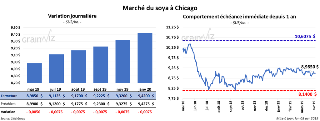 Dans son rapport sur les inspections à l’exportation présenté durant l’avant-midi, le USDA a indiqué que 888,160 tonnes de soya US avaient été exportées dans la semaine du 4 avril dernier. C’est un peu plus que le double du résultat de la semaine précédente. Il s’agit également d’une hausse de 21,4 % comparativement à la même période l’an passé. Un total de 385,303 tonnes de soya US ont été exportées vers la Chine. Les médias chinois continuent de suggérer que les obstacles à un accord commercial avec les États-Unis sont gérables. De son côté, le Bureau du représentant américain au Commerce estime qu’il reste encore beaucoup de difficultés à surmonter.