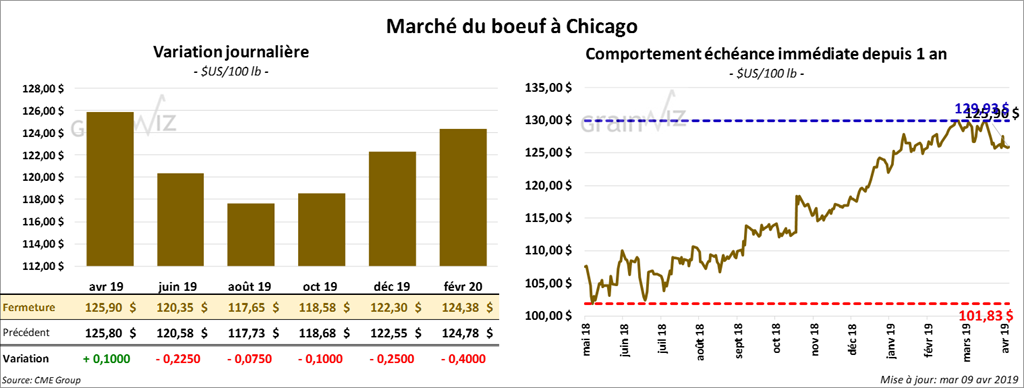 Les contrats de bœuf à Chicago ont clôturé dans le rouge de 7,5 à 40 cents. Par contre, le contrat avril 19 a fini la journée en hausse de 10 cents. Les contrats de veau aux échéances les plus rapprochées ont terminé la session à la baisse, mais ceux aux échéances les plus éloignées ont fini en progression.
