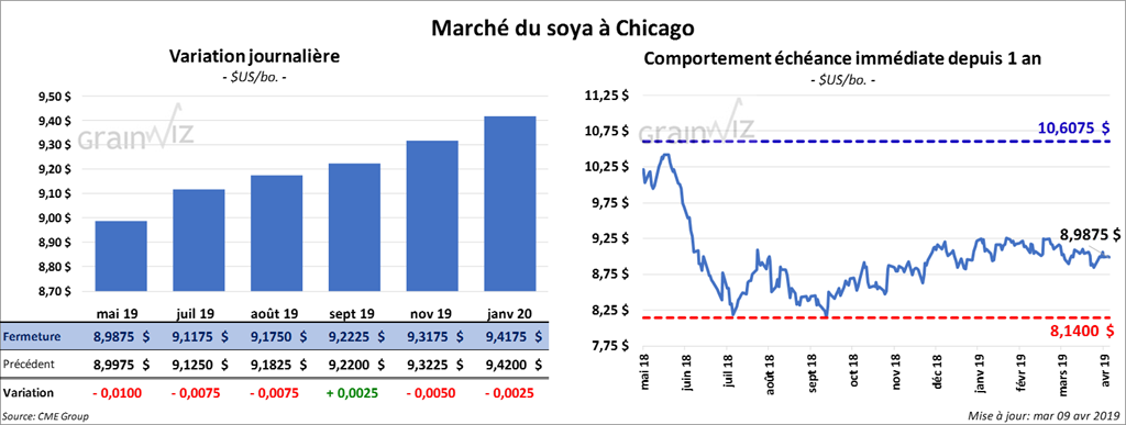 Les contrats de soya à Chicago ont terminé la session progression partagée d’une fraction de cent. Les contrats de tourteau ont fini la journée en baisse de 10 cents/tonne. L’huile a gagné 16 points.