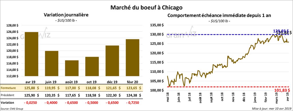 La plupart des contrats de bœuf à Chicago ont terminé la journée en baisse de 40 à 75 cents. Les contrats de veau ont également clôturé en baisse de 30 à 97,5 cents.