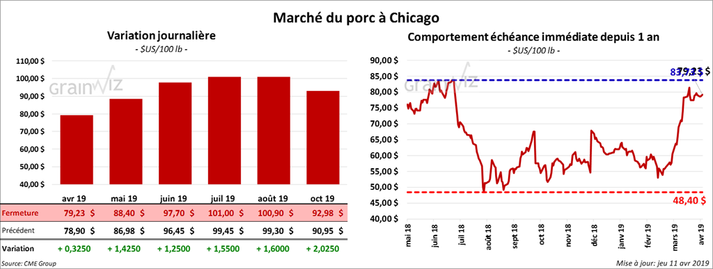 La majorité des contrats de porc US 2019 ont terminé avec des gains de 1,25 $ à 2,025 $. Le contrat avril 19, qui devrait expirer vendredi, a clôturé en hausse de 32,5 cents.
