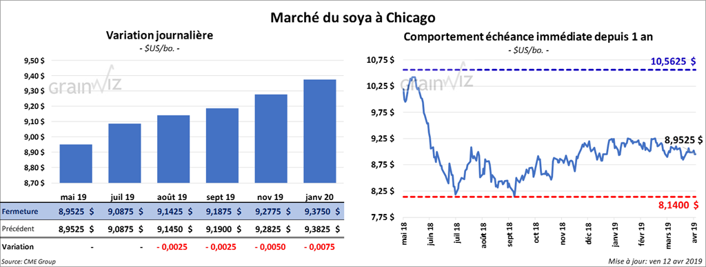 Les contrats de soya US aux échéances les plus rapprochées ont terminé la semaine au neutre à baissier d’une fraction de cent. Les contrats de tourteau aux échéances les plus rapprochées ont clôturé à la hausse de 70 cents/tonne. Dans le cas de l’huile, le contrat mai 19 a baissé de 3 points.