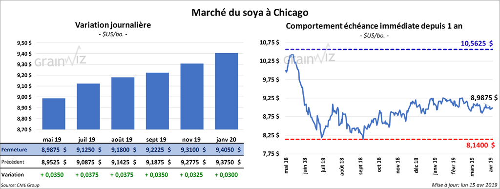 Les contrats de soya US ont fini la session avec des gains de 3 à 3 ¾ cents. Les contrats de tourteau aux échéances les plus rapprochées ont également terminé la journée en hausse de 3,10 $/tonne. Par contre, l’huile a reculé de 14 points.
