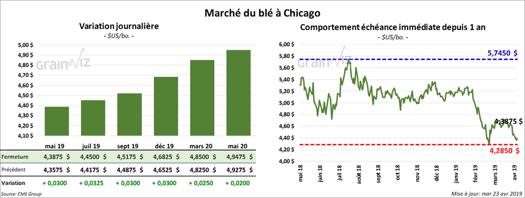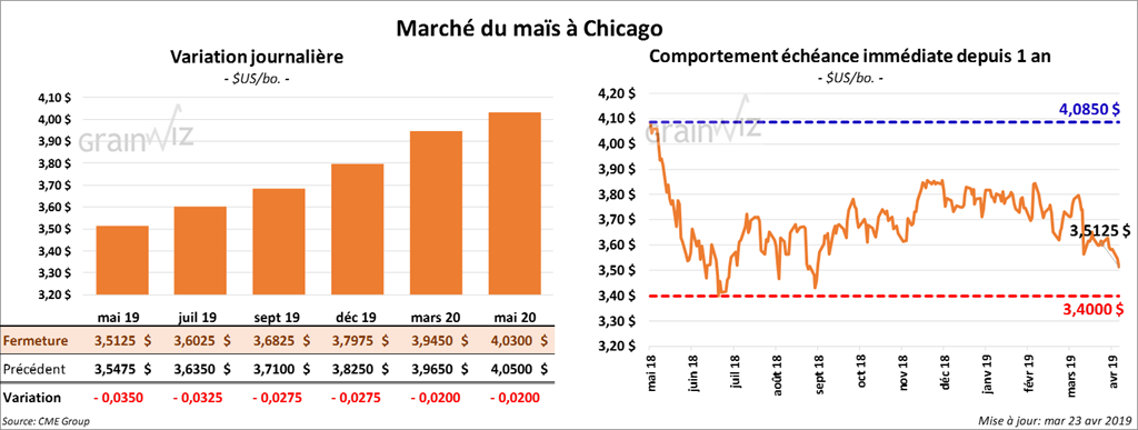 Les contrats de maïs à Chicago ont terminé la session en baisse de 1 à 3 ½ cents. Tous les contrats 2019 ont touché des nouveaux bas.
