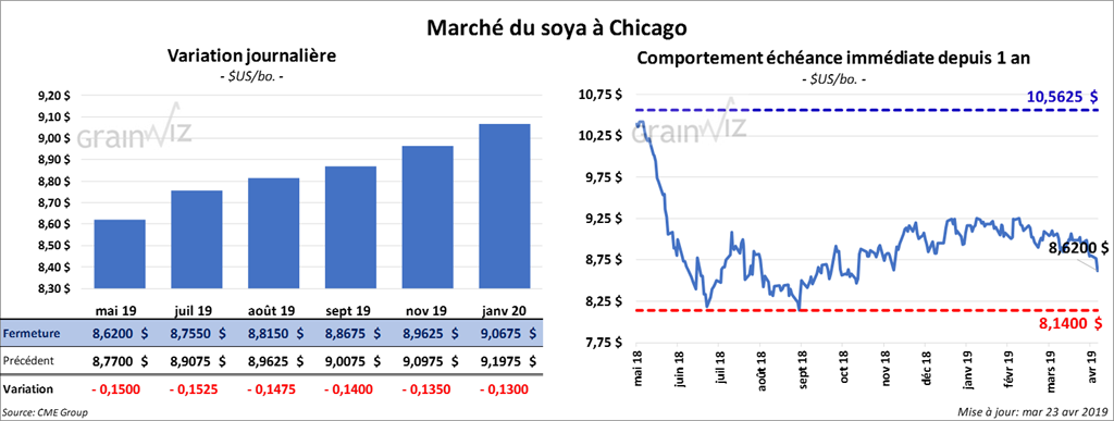 Les contrats de soya à Chicago ont clôturé dans le rouge de 13 à 15 ¼ cents. Les contrats 2019 aux échéances les plus rapprochées ont touché des nouveaux bas. Les contrats de tourteau ont fini la journée en baisse de 1,50 $/tonne. Le contrat d’huile mai 19 a également reculé de 64 points.