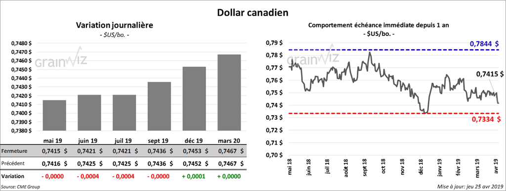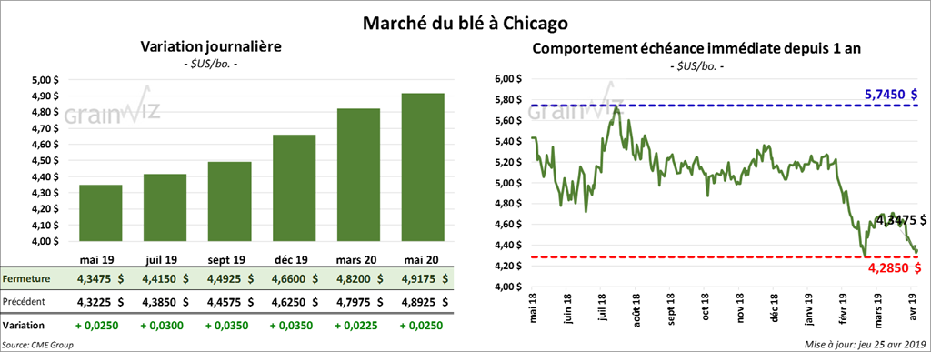 Les contrats de blé à Chicago et à Minneapolis ont fini la journée en hausse d’une fraction à 3 cents. À Kansas, les contrats ont terminé sur une note partagée. Les options mai 19 expirent demain.