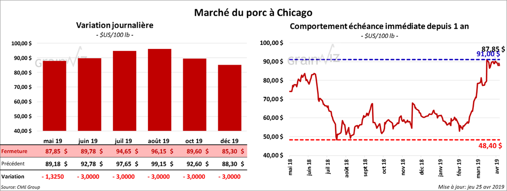 Les contrats de porc à Chicago ont clôturé avec de fortes baisses. Le contrat mai 19 a fini la journée en recul de 1,325 $.