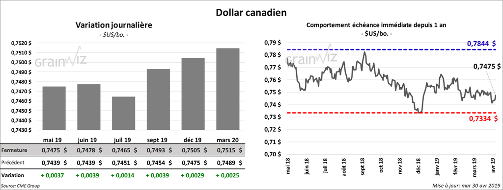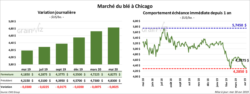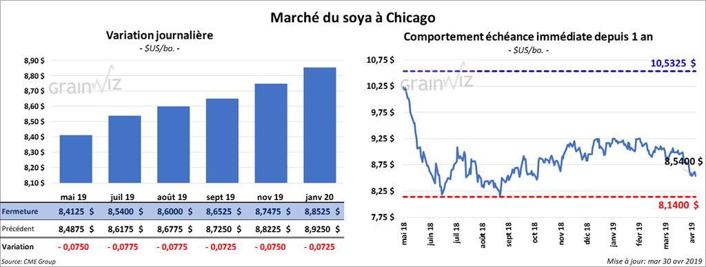 La plupart des contrats de soya US aux échéances les plus rapprochées ont terminé la session à la baisse de 6 à 6 ¾ cents. Le contrat mai 19 a perdu 43 cents (4,87 %) et il continue de toucher son bas niveau. Les contrats de tourteau ont également clôturé dans le rouge de 1,20 $/tonne. L’huile a reculé de 30 points.