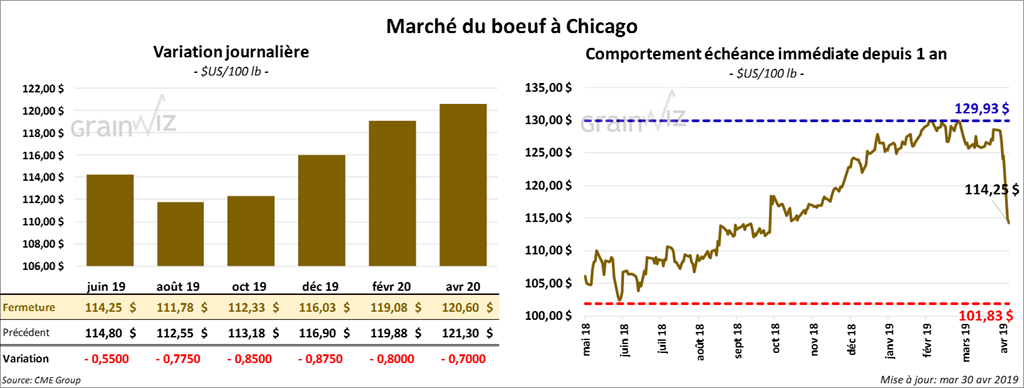 Ce mardi, les contrats de bœuf à Chicago ont terminé la journée en baisse de 55 cents à 1,025 $. Les contrats de veau ont également reculé de 1,625 $ à 1,925 $.