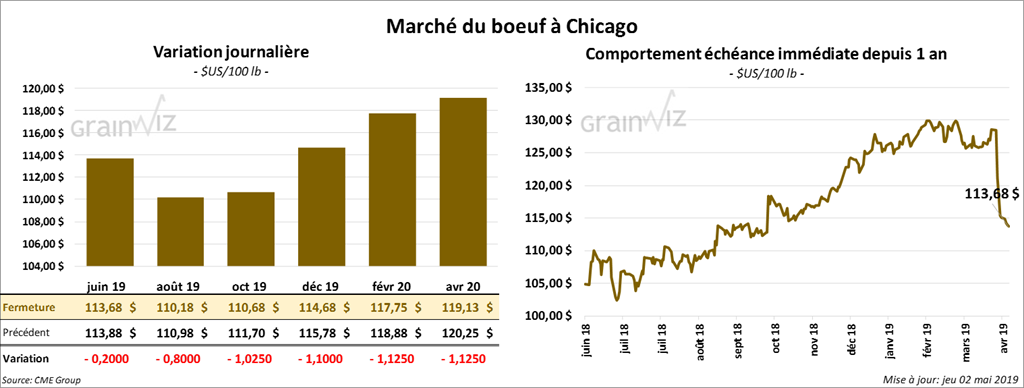 Les contrats de bœuf à Chicago ont terminé la journée avec des pertes de 20 cents à 1,125 $. Le contrat juin 19 est en baisse pour une 9ème session consécutive. Les contrats de veau ont également fini dans le rouge de 1,325 $ à 2,40 $.