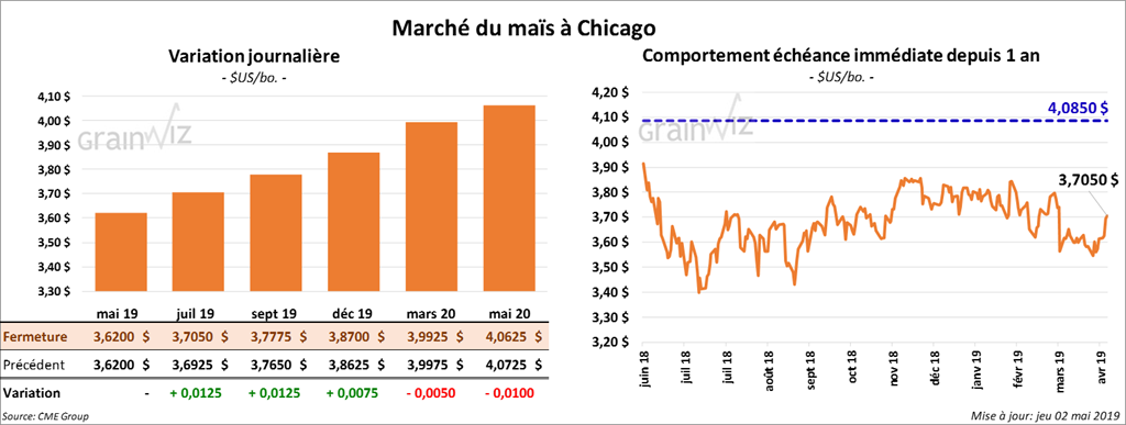 Les contrats de maïs à Chicago ont terminé la journée sur une note partagée. Les contrats 2019 ont progressé de ¾ à 2 cents. Par contre, les contrats aux échéances les plus éloignées ont clôturé en baisse.