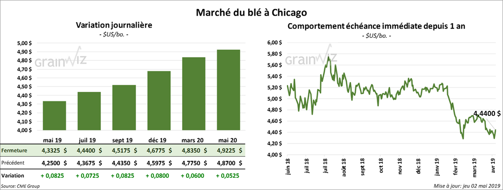 Ce jeudi, la plupart des contrats de blé à Chicago et à Minneapolis ont terminé la journée avec des gains de 6 à 10 ¼ cents. À Kansas, le marché, qui a été plus faible, a tout de même clôturé en hausse de 3 à 6 cents.