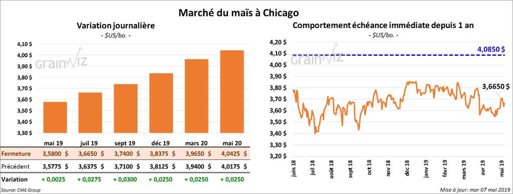 Pour le rapport d’offre et de demande du USDA, qui sera rendu public vendredi, un sondage effectué par Bloomberg indique que les analystes anticipent, en moyenne, une production de maïs US à 14,841 milliards de boisseaux. Un sondage de Reuters montre également que les inventaires de maïs US de fin d’année 2018/2019 pourraient être à la hausse de 20 millions de boisseaux comparativement à avril dernier à 2,055 milliards de boisseaux ce mois-ci.